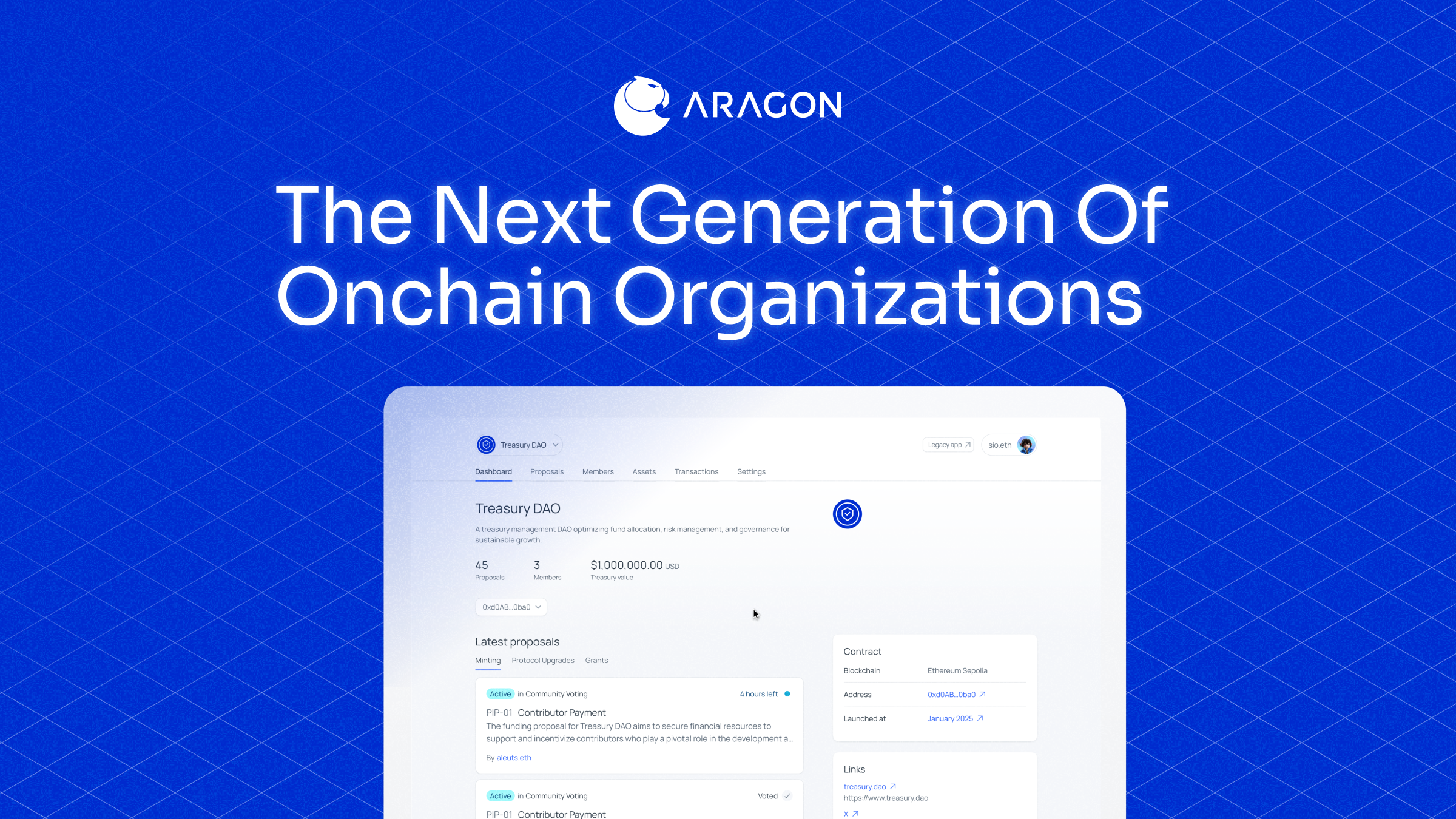 Aragon powers protocols with products and services designed to manage capital allocation, governance, and ownership at scale.