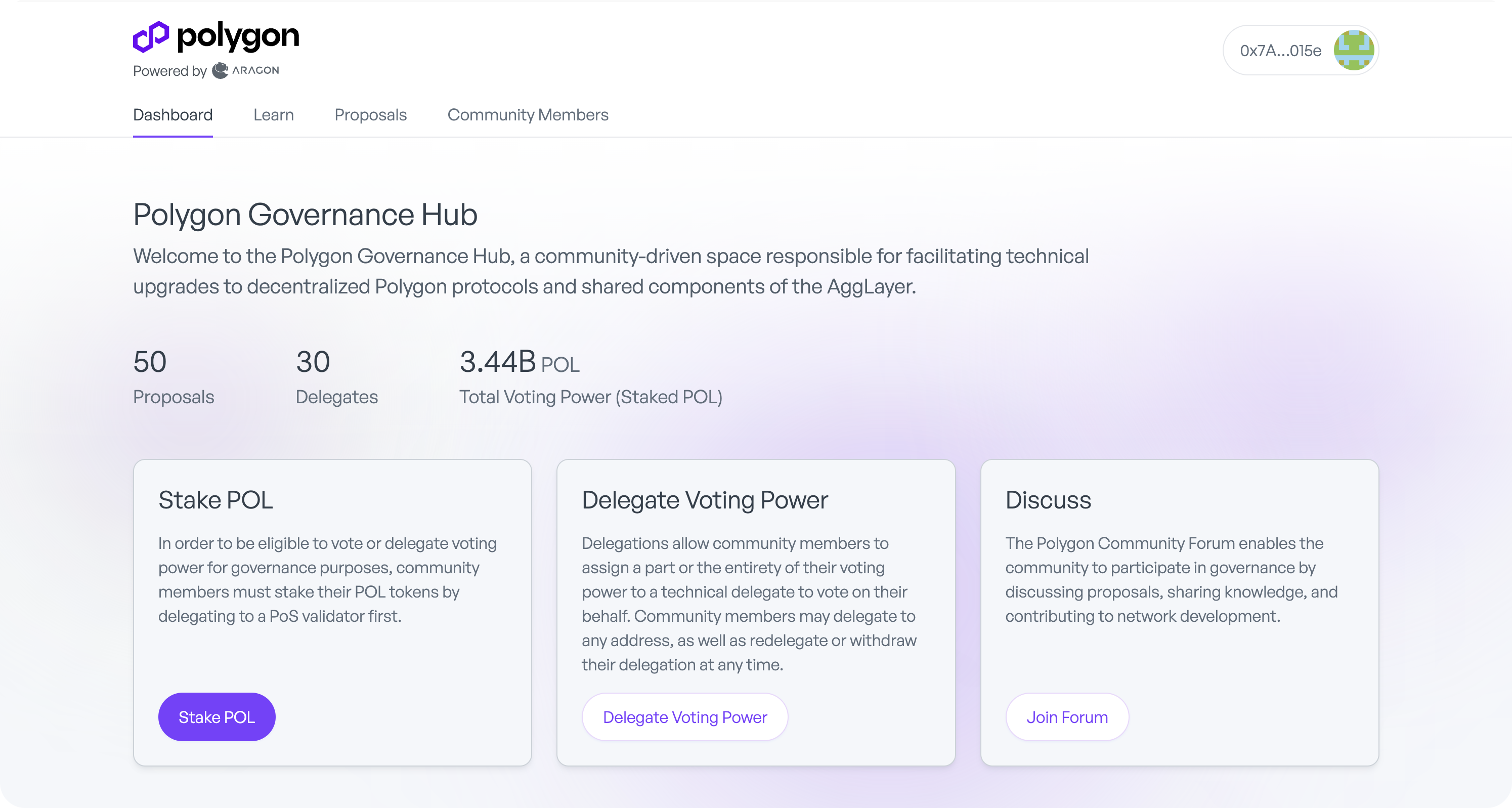 Transparent technical proposal process for system smart contract upgrades. Staked token holders can split their delegations amongst various delegates and the community can vote to signal their approval of protocol upgrades.