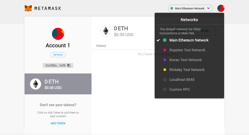 On your wallet there are some pre-configured networks. To explore them, go to the top right, you should see a dropdown menu with Main Ethereum Network selected. When this option is selected, you are able to interact directly with the main Ethereum blockchain.
